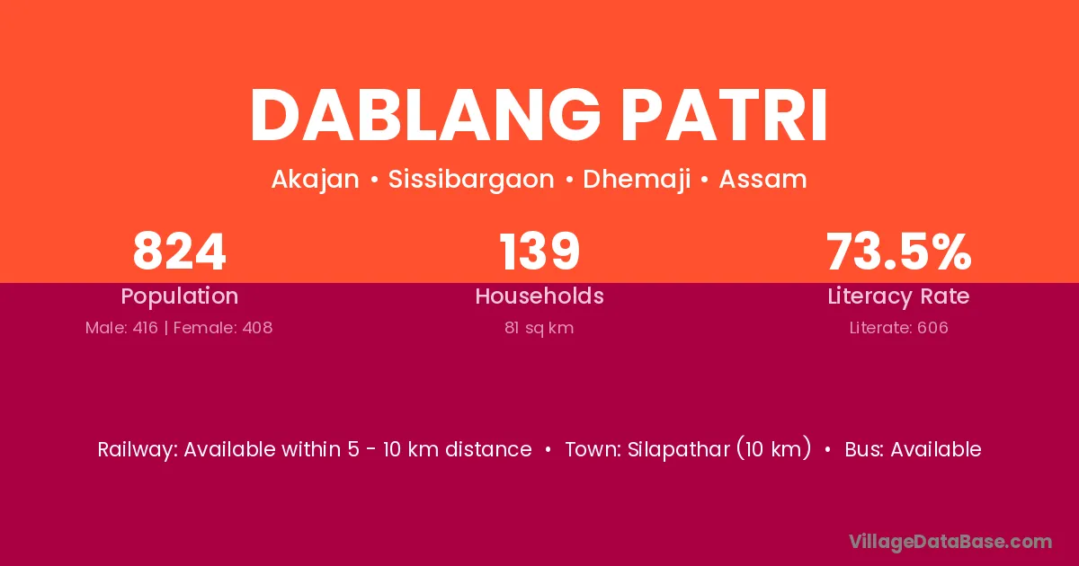 Silapathar (10 km) is the nearest town to Dablang Patri village for major economic activities and is located approximately 10 km away.