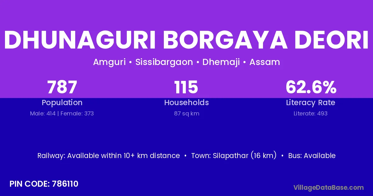 According to Census 2011 information, the village code of Dhunaguri Borgaya Deori village is 786110.