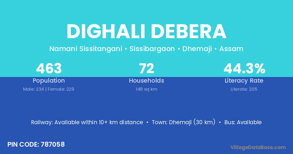 Dhemaji (30 km) is the nearest town to Dighali Debera village for major economic activities and is located approximately 30 km away.