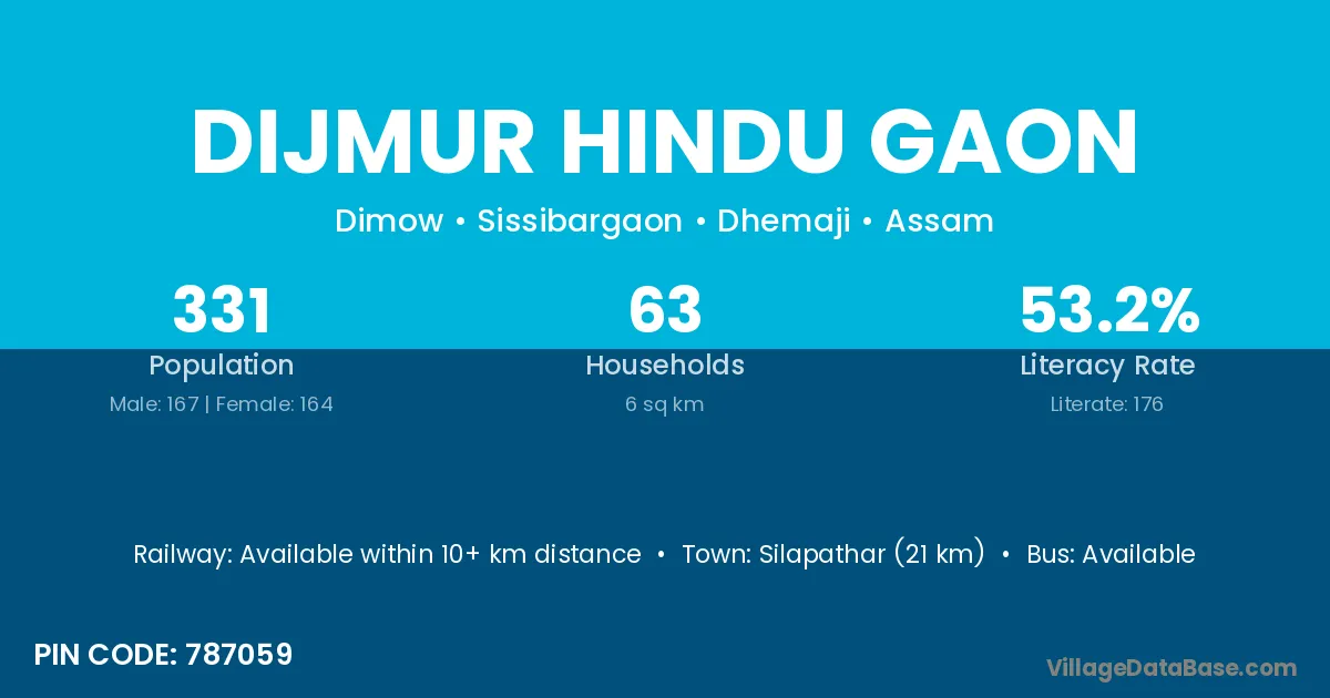 Dijmur Hindu Gaon village has a total population of 331 people, of which 167 are males and 164 are females.
