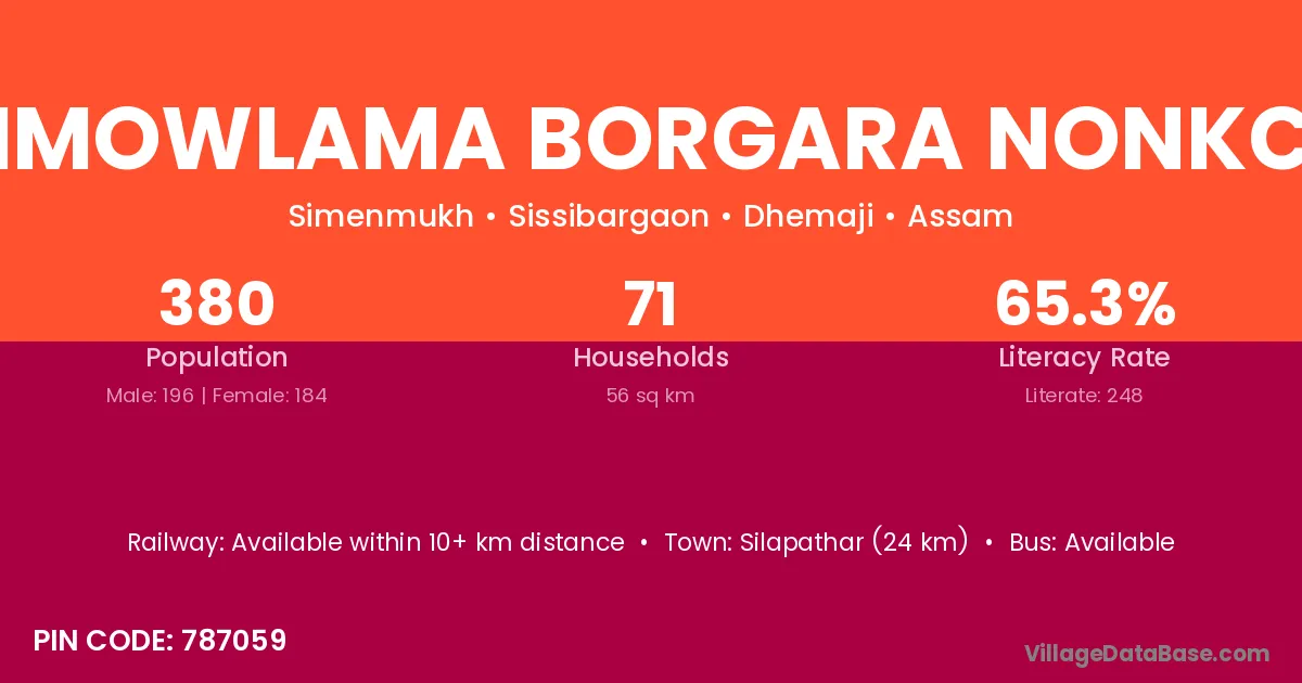Silapathar (24 km) is the nearest town to Dimowlama Borgara Nonkch village for major economic activities and is located approximately 24 km away.