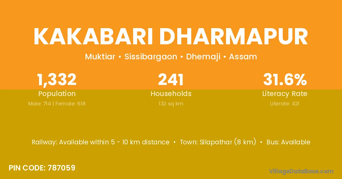 Silapathar (8 km) is the nearest town to Kakabari Dharmapur village for major economic activities and is located approximately 8 km away.
