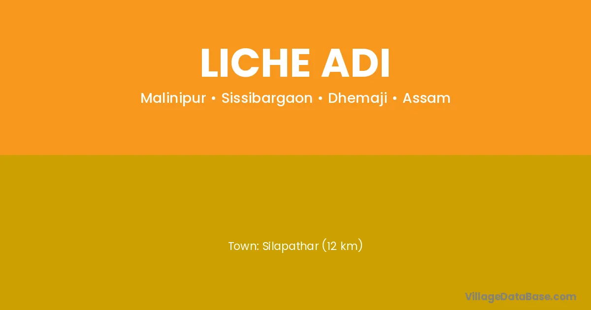 Silapathar (12 km) is the nearest town to Liche Adi village for major economic activities and is located approximately 12 km away.