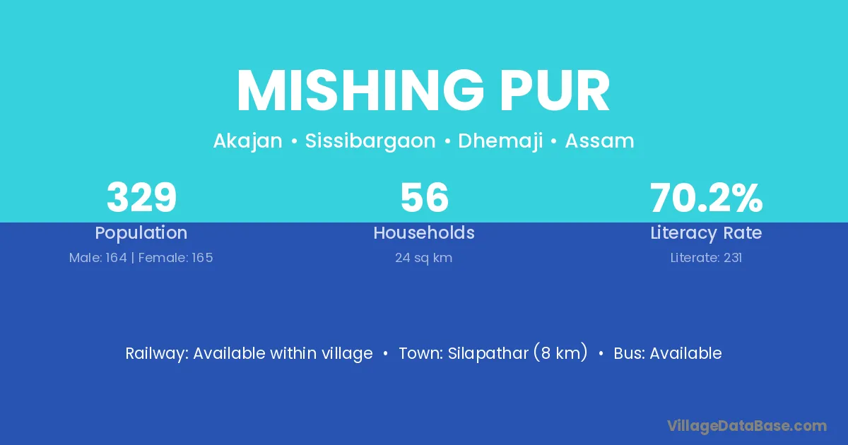 Silapathar (8 km) is the nearest town to Mishing Pur village for major economic activities and is located approximately 8 km away.