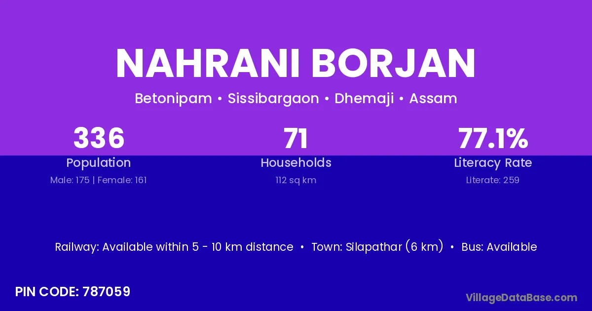 Silapathar (6 km) is the nearest town to Nahrani Borjan village for major economic activities and is located approximately 6 km away.