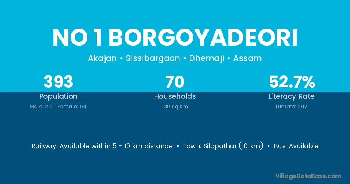 Silapathar (10 km) is the nearest town to No 1 Borgoyadeori village for major economic activities and is located approximately 10 km away.