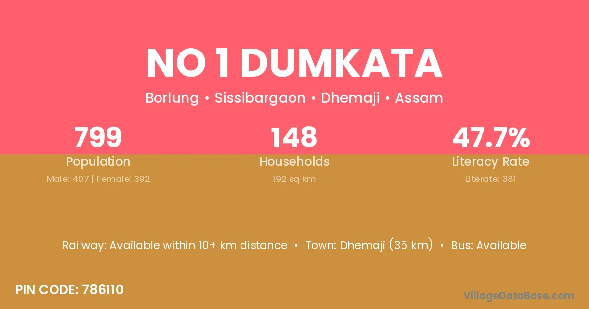 No 1 Dumkata village has a total population of 799 people, of which 407 are males and 392 are females.