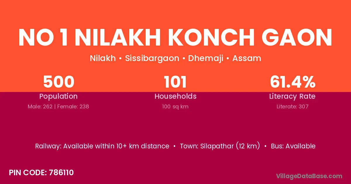 No 1 Nilakh Konch Gaon village has a total population of 500 people, of which 262 are males and 238 are females.