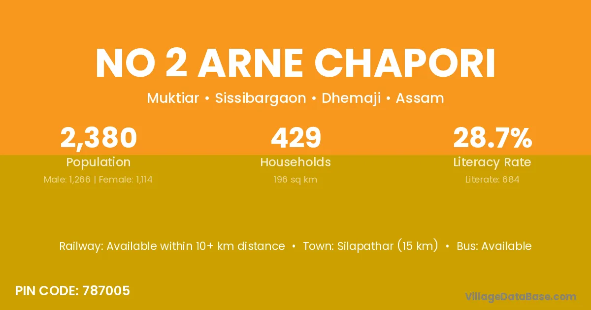 Silapathar (15 km) is the nearest town to No 2 Arne Chapori village for major economic activities and is located approximately 15 km away.
