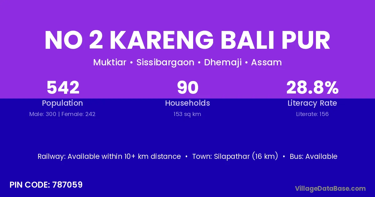 Silapathar (16 km) is the nearest town to No 2 Kareng Bali Pur village for major economic activities and is located approximately 16 km away.