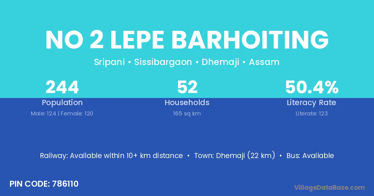 Dhemaji (22 km) is the nearest town to No 2 Lepe Barhoiting village for major economic activities and is located approximately 22 km away.