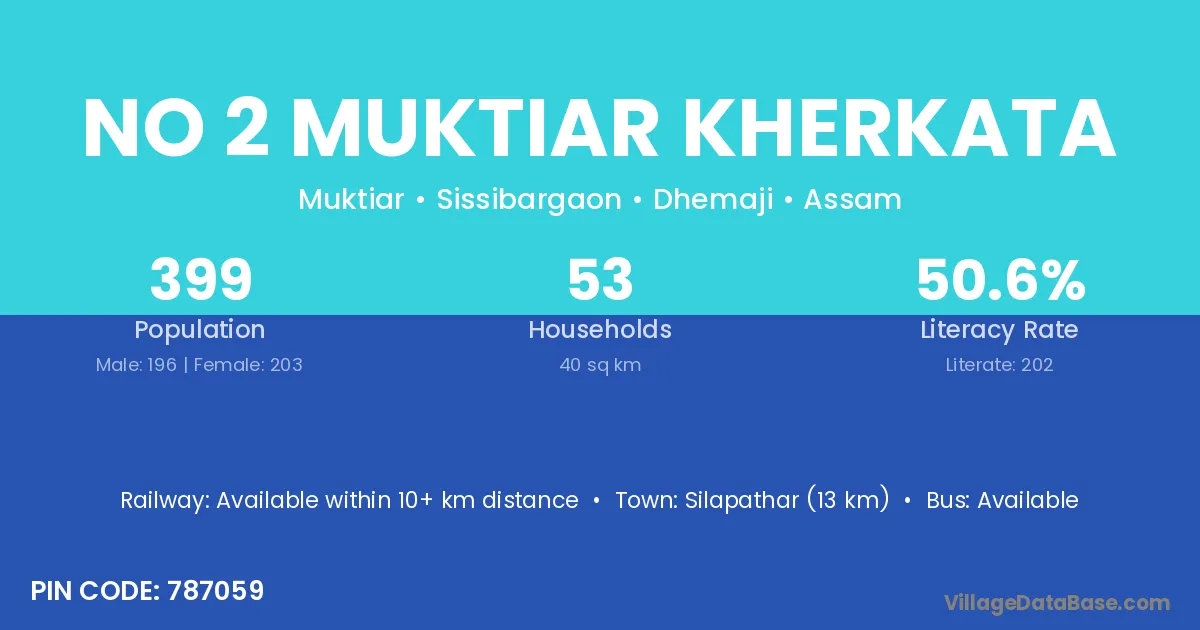 Silapathar (13 km) is the nearest town to No 2 Muktiar Kherkata village for major economic activities and is located approximately 13 km away.