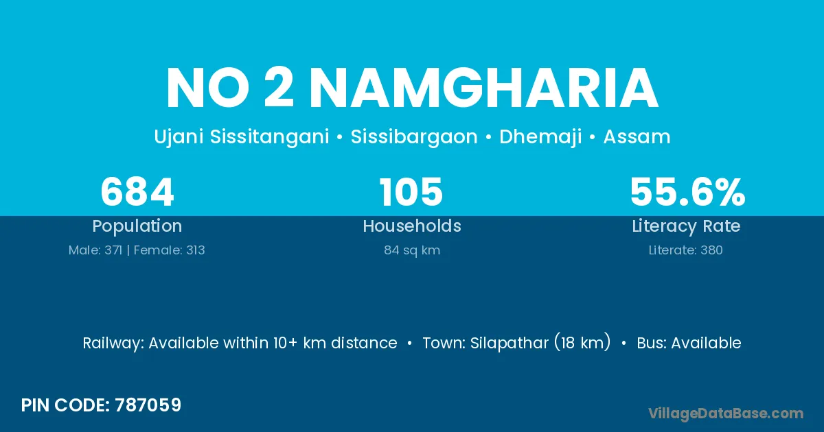 Silapathar (18 km) is the nearest town to No 2 Namgharia village for major economic activities and is located approximately 18 km away.