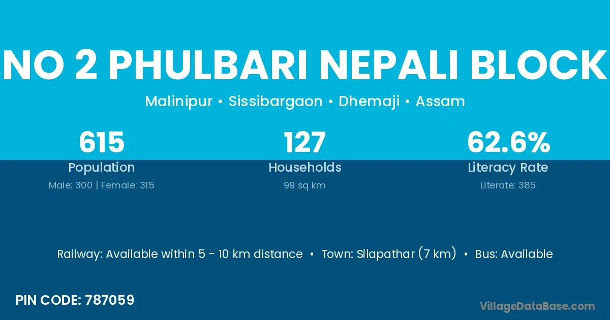 No 2 Phulbari Nepali Block village has a total population of 615 people, of which 300 are males and 315 are females.