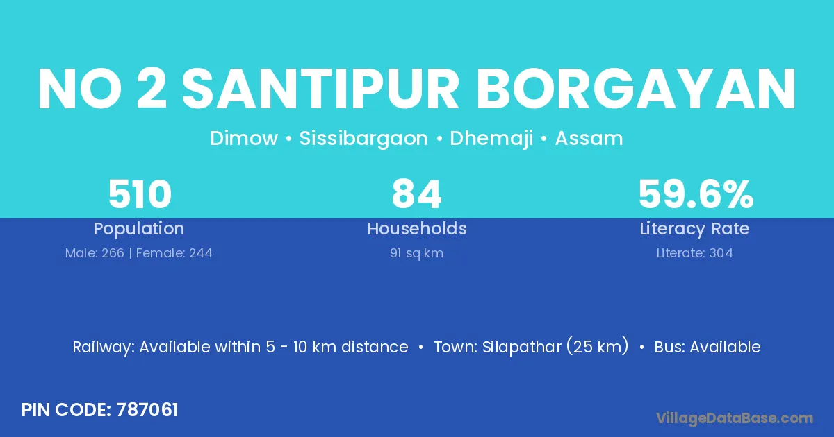 Silapathar (25 km) is the nearest town to No 2 Santipur Borgayan village for major economic activities and is located approximately 25 km away.