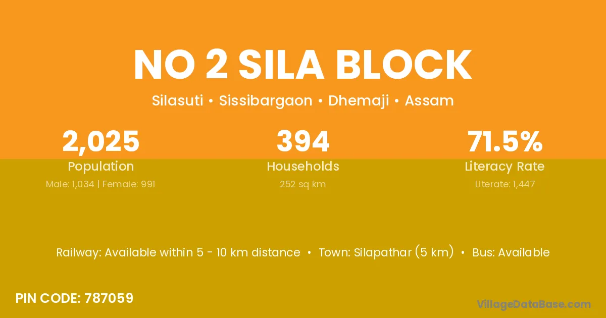 Silapathar (5 km) is the nearest town to No 2 Sila Block village for major economic activities and is located approximately 5 km away.