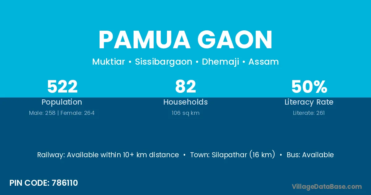 Silapathar (16 km) is the nearest town to Pamua Gaon village for major economic activities and is located approximately 16 km away.