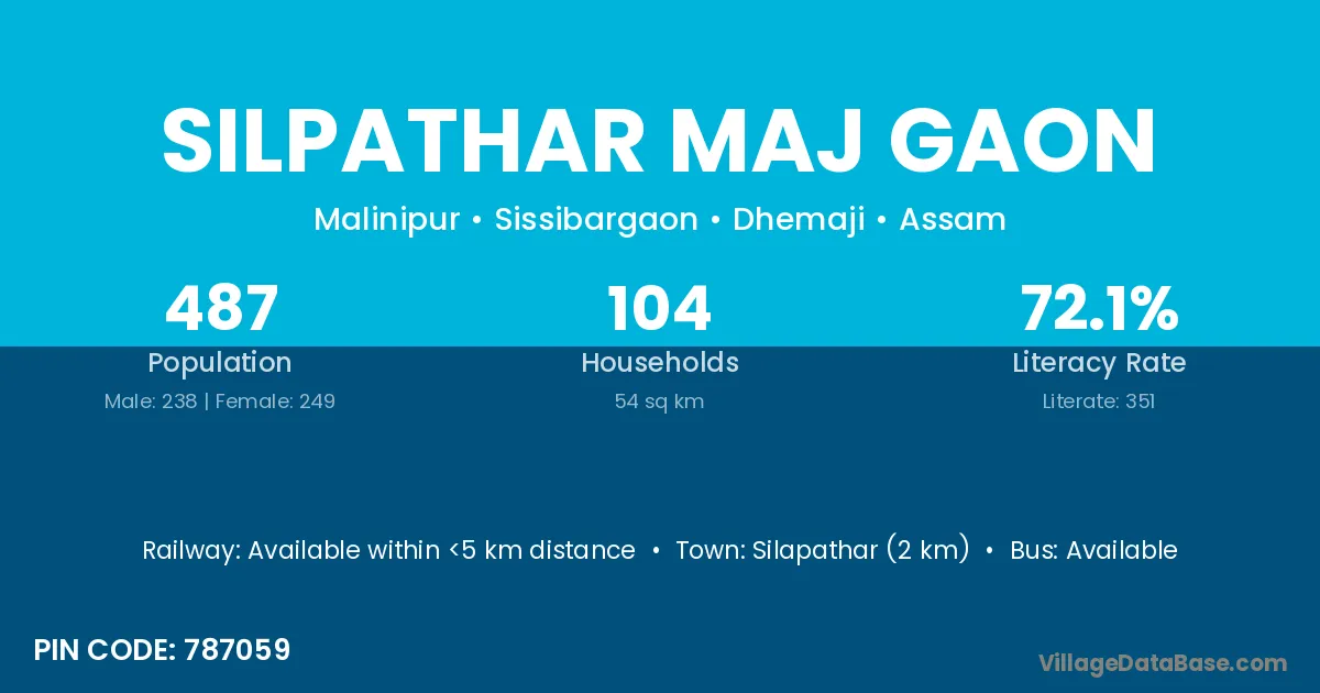 Silapathar (2 km) is the nearest town to Silpathar Maj Gaon village for major economic activities and is located approximately 2 km away.
