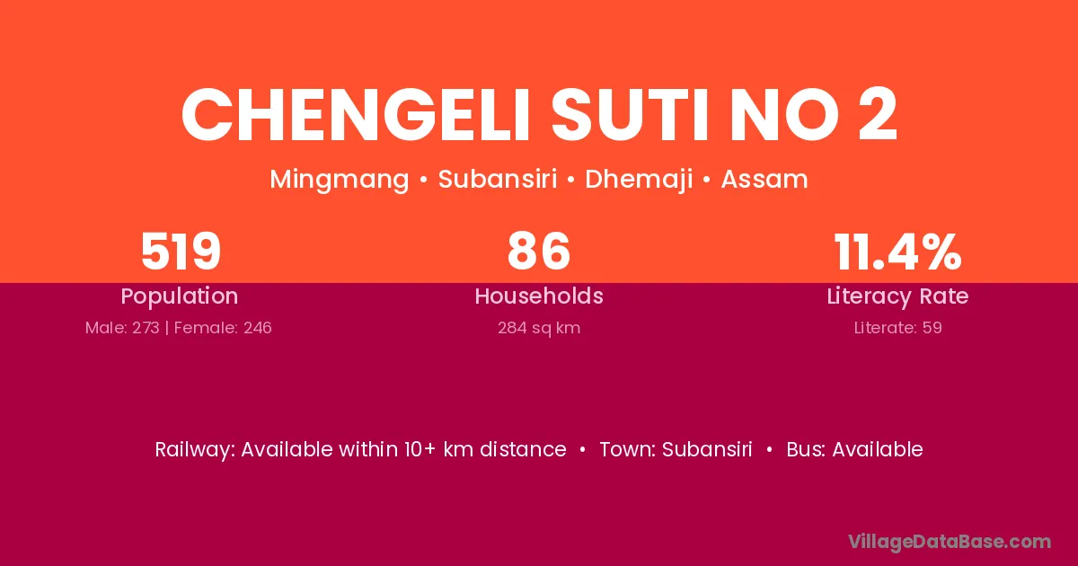 Subansiri is the nearest town to Chengeli Suti No 2 village for major economic activities