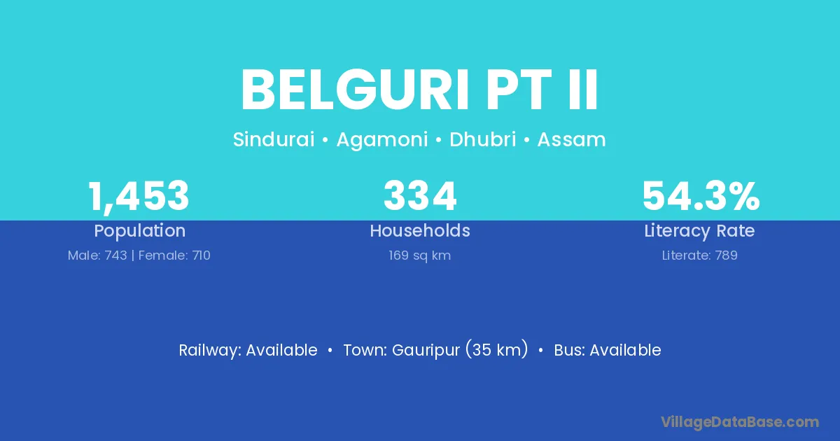 Gauripur (35 km) is the nearest town to Belguri Pt Ii village for major economic activities and is located approximately 35 km away.