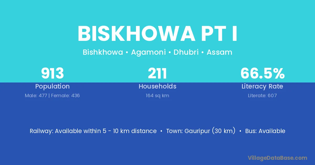 Gauripur (30 km) is the nearest town to Biskhowa Pt I village for major economic activities and is located approximately 30 km away.