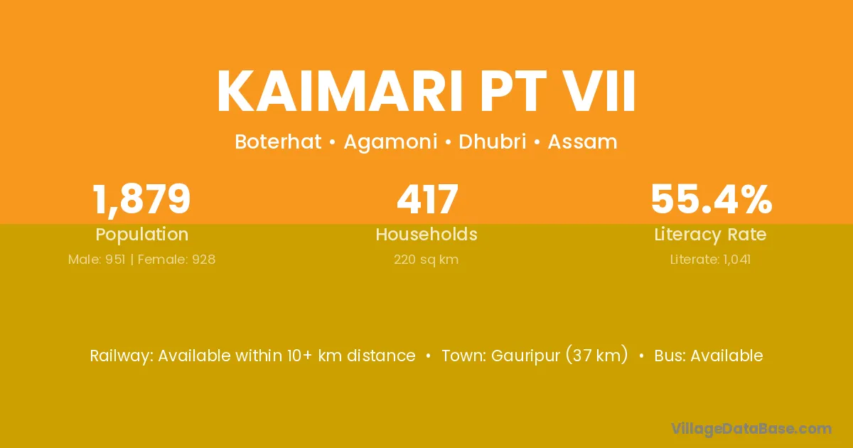 Gauripur (37 km) is the nearest town to Kaimari Pt Vii village for major economic activities and is located approximately 37 km away.