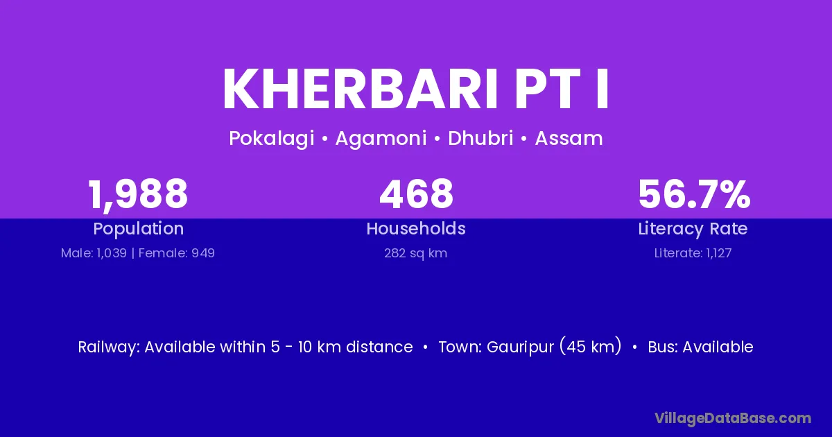 Gauripur (45 km) is the nearest town to Kherbari Pt I village for major economic activities and is located approximately 45 km away.