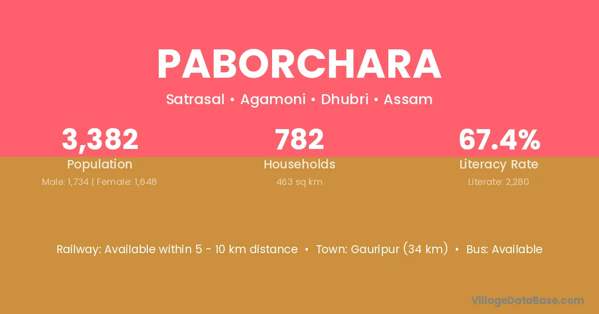 Paborchara village has a total population of 3,382 people, of which 1,734 are males and 1,648 are females.