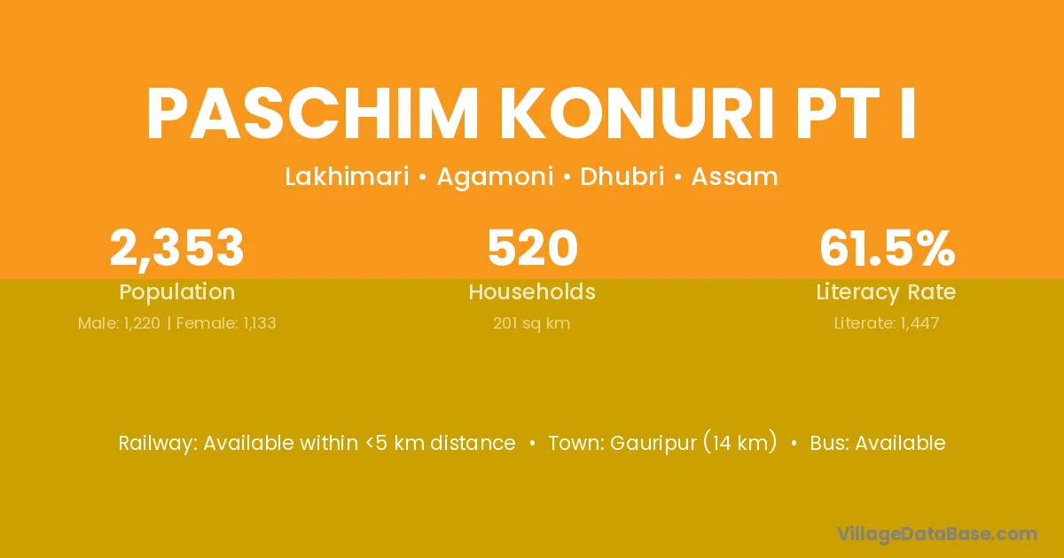 Paschim Konuri Pt I village has a total population of 2,353 people, of which 1,220 are males and 1,133 are females.