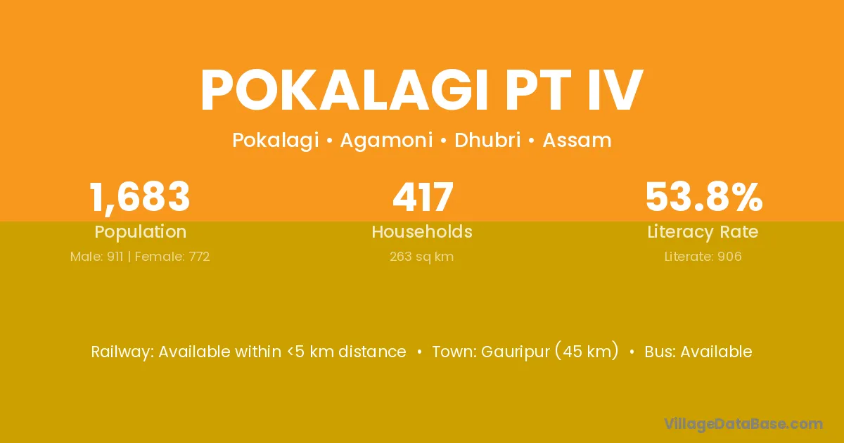 Gauripur (45 km) is the nearest town to Pokalagi Pt Iv village for major economic activities and is located approximately 45 km away.