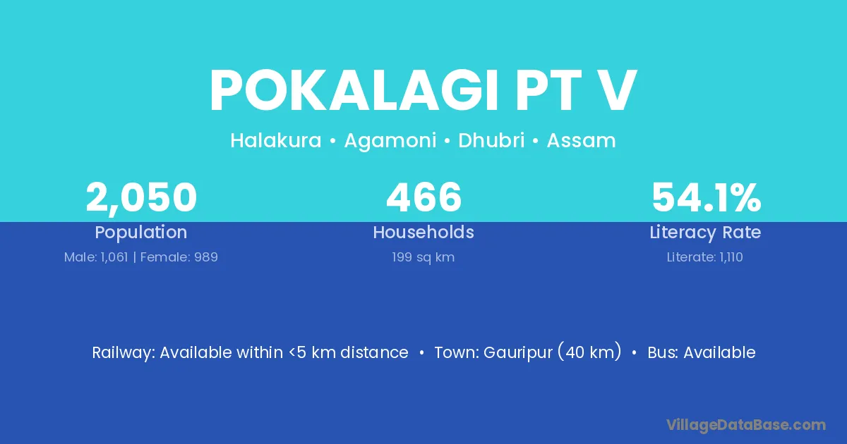 Gauripur (40 km) is the nearest town to Pokalagi Pt V village for major economic activities and is located approximately 40 km away.