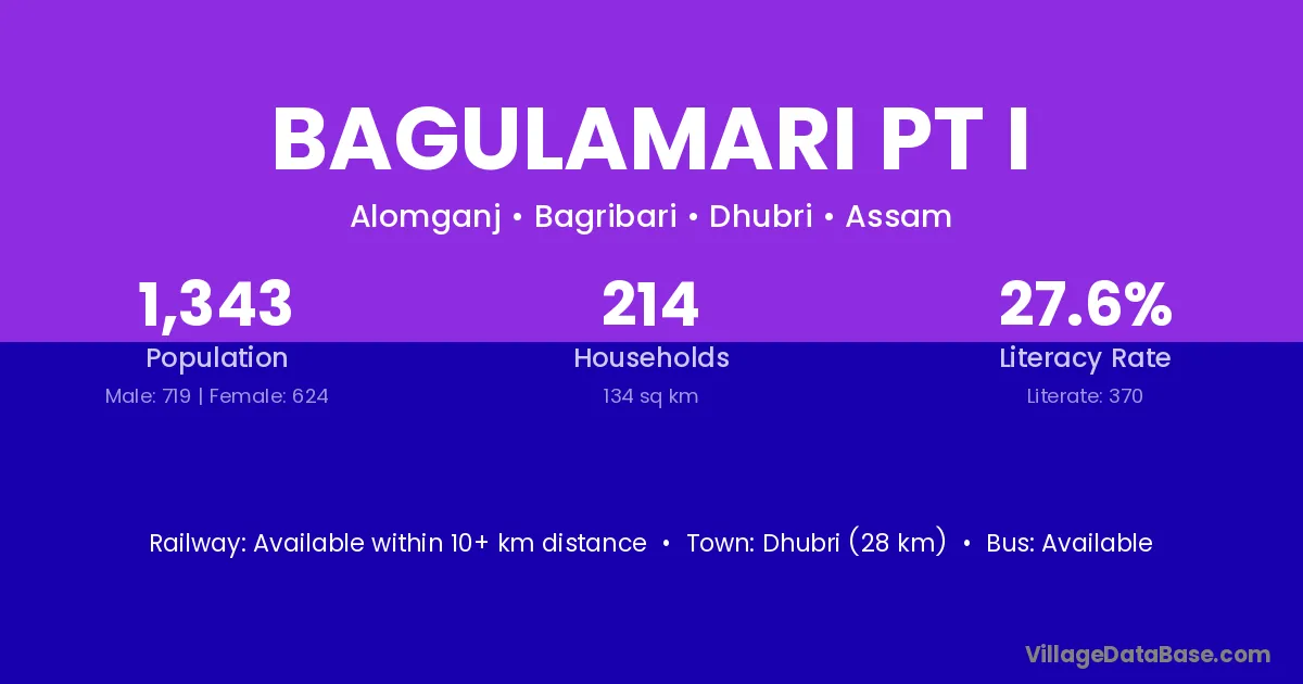 Dhubri (28 km) is the nearest town to Bagulamari Pt I village for major economic activities and is located approximately 28 km away.