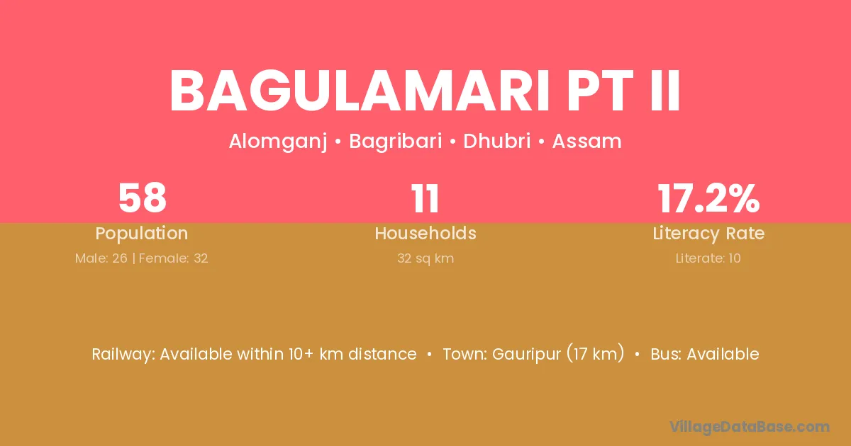 Bagulamari Pt Ii village has a total population of 58 people, of which 26 are males and 32 are females.