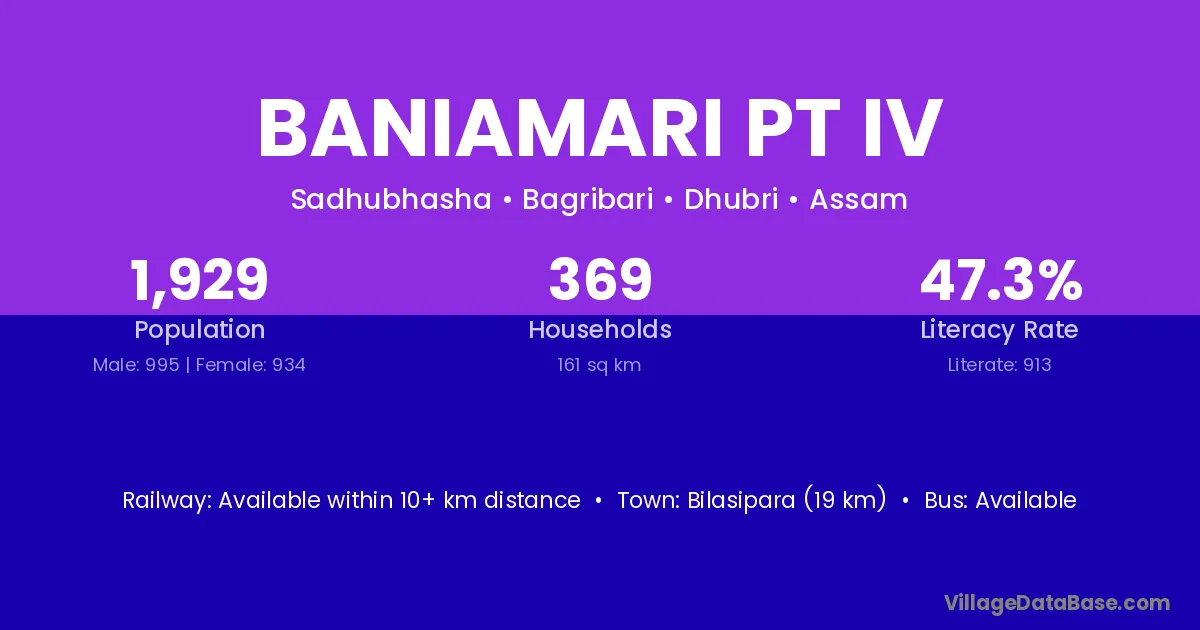 Bilasipara (19 km) is the nearest town to Baniamari Pt Iv village for major economic activities and is located approximately 19 km away.