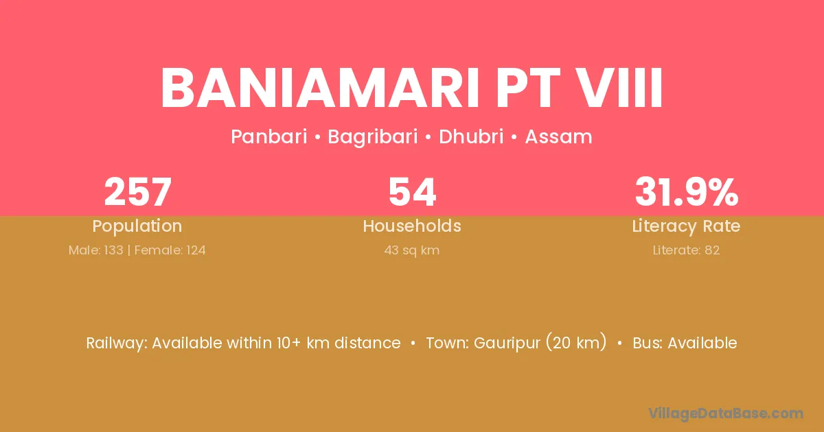 Baniamari Pt Viii village has a total population of 257 people, of which 133 are males and 124 are females.