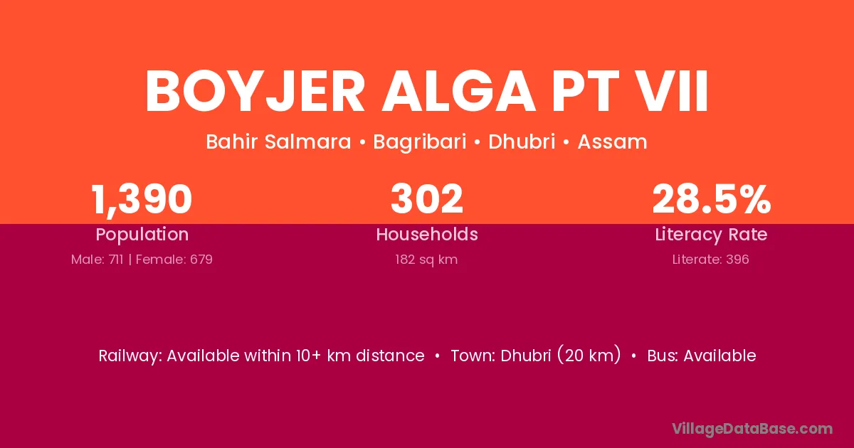 Dhubri (20 km) is the nearest town to Boyjer Alga Pt Vii village for major economic activities and is located approximately 20 km away.