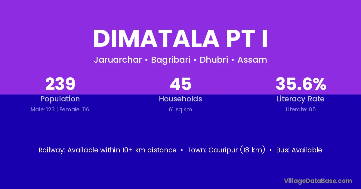 Gauripur (18 km) is the nearest town to Dimatala Pt I village for major economic activities and is located approximately 18 km away.