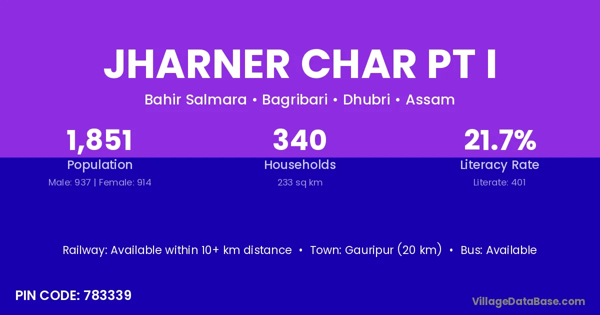 Gauripur (20 km) is the nearest town to Jharner Char Pt I village for major economic activities and is located approximately 20 km away.