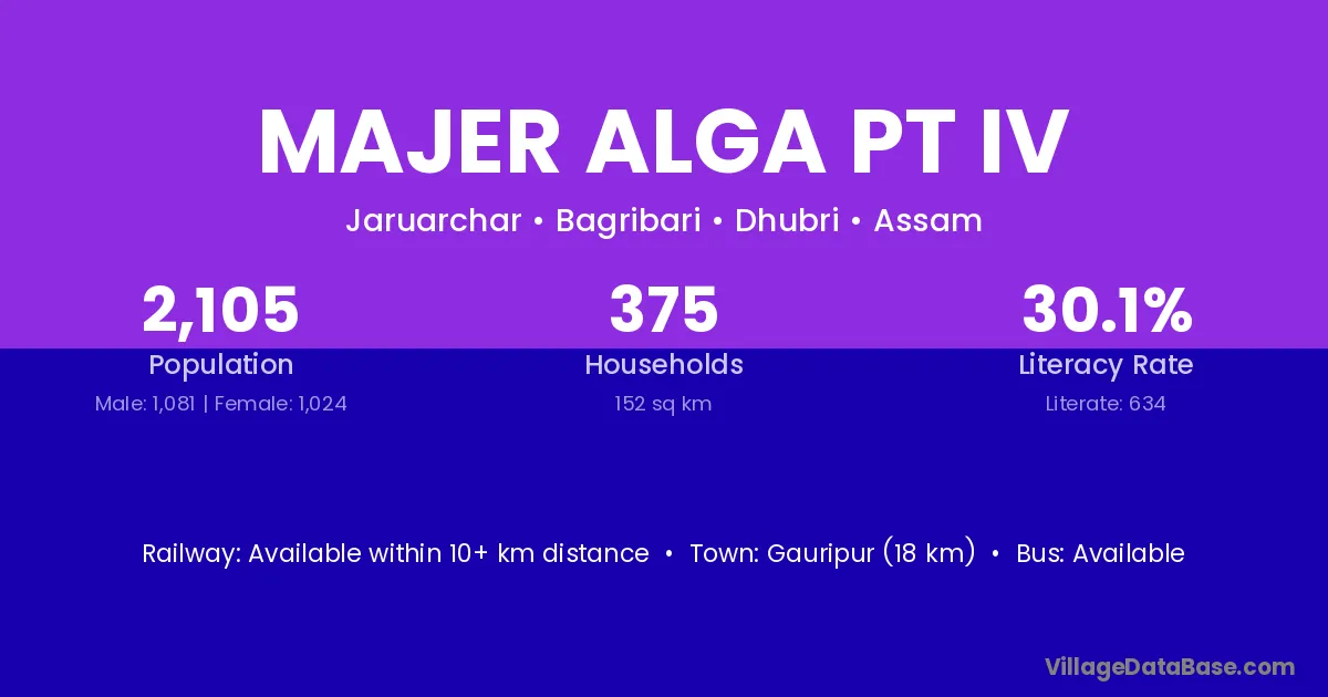 Gauripur (18 km) is the nearest town to Majer Alga Pt Iv village for major economic activities and is located approximately 18 km away.