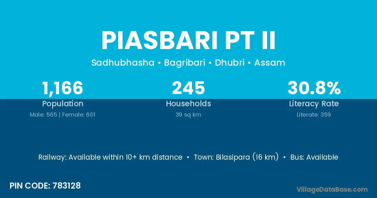 Bilasipara (16 km) is the nearest town to Piasbari Pt Ii village for major economic activities and is located approximately 16 km away.