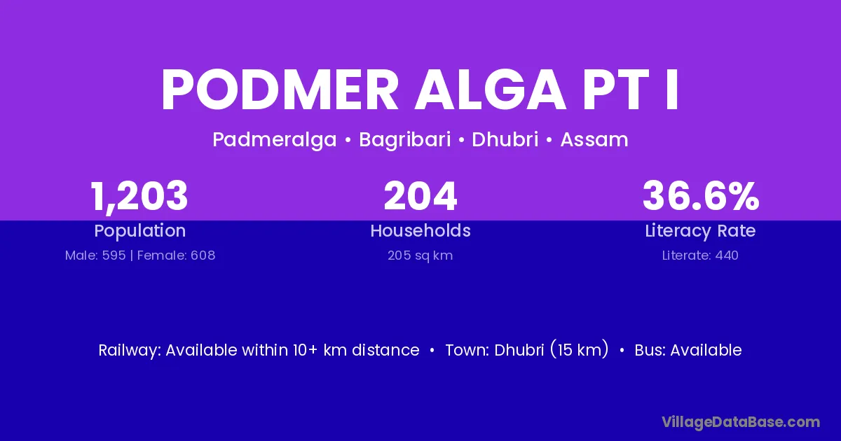 Dhubri (15 km) is the nearest town to Podmer Alga Pt I village for major economic activities and is located approximately 15 km away.