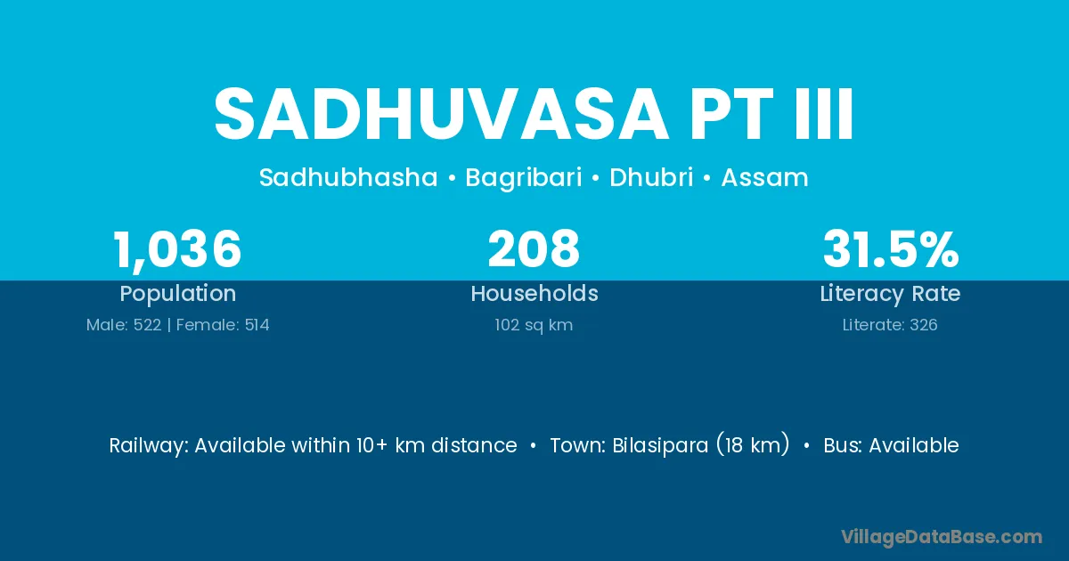 Bilasipara (18 km) is the nearest town to Sadhuvasa Pt Iii village for major economic activities and is located approximately 18 km away.