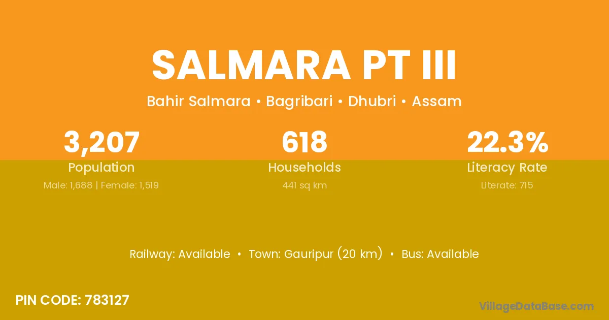 Salmara Pt Iii village has a total population of 3,207 people, of which 1,688 are males and 1,519 are females.