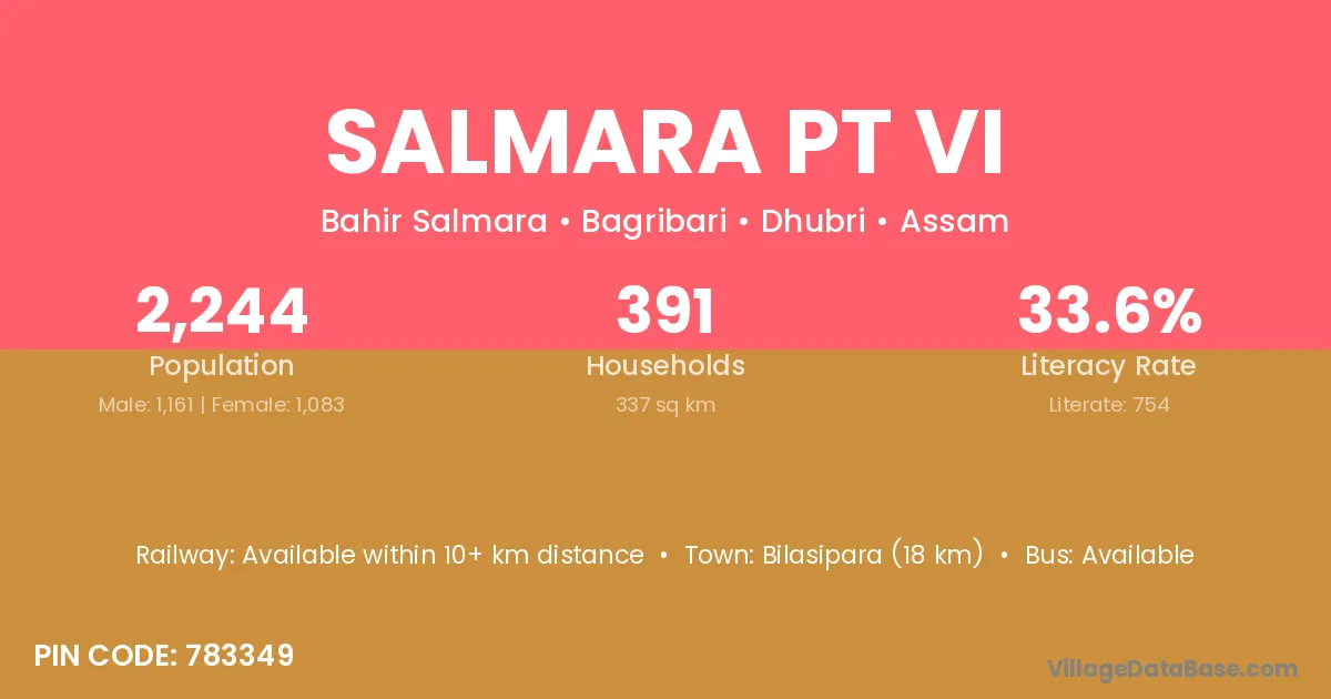 Bilasipara (18 km) is the nearest town to Salmara Pt Vi village for major economic activities and is located approximately 18 km away.