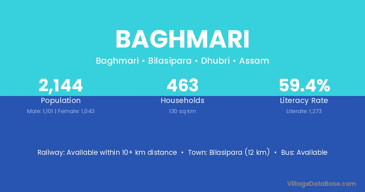 Bilasipara (12 km) is the nearest town to Baghmari village for major economic activities and is located approximately 12 km away.