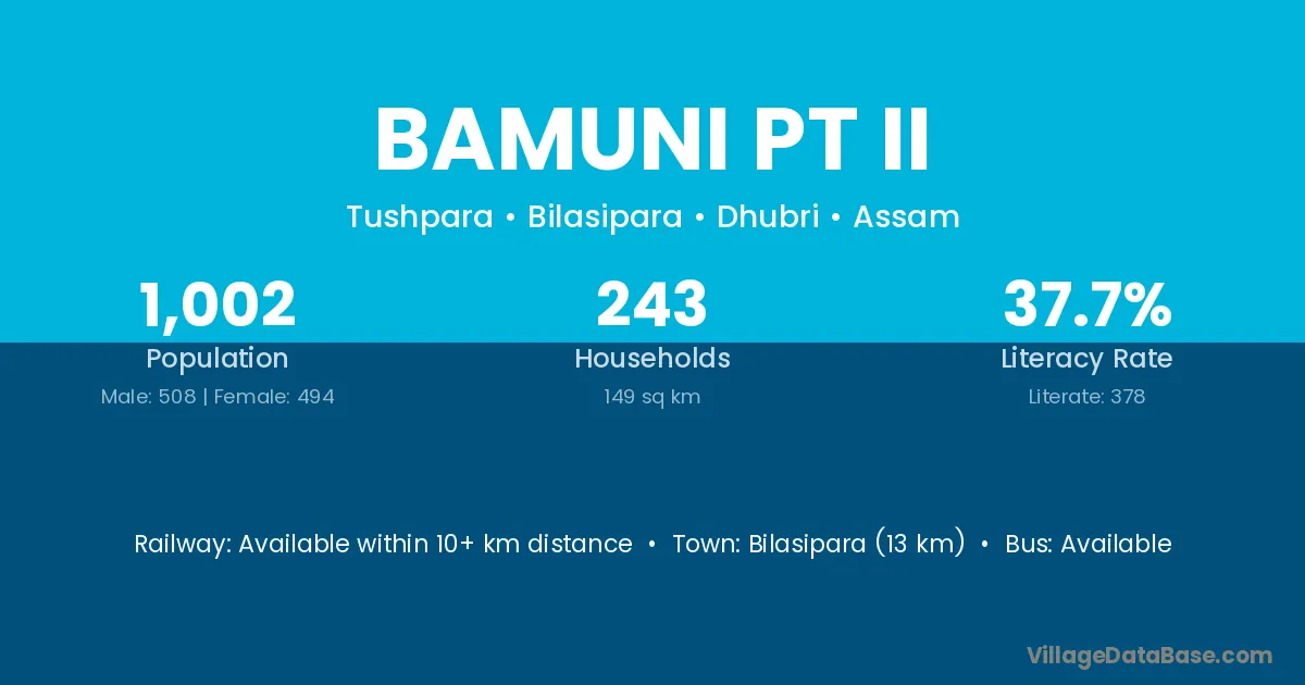 Bilasipara (13 km) is the nearest town to Bamuni Pt Ii village for major economic activities and is located approximately 13 km away.