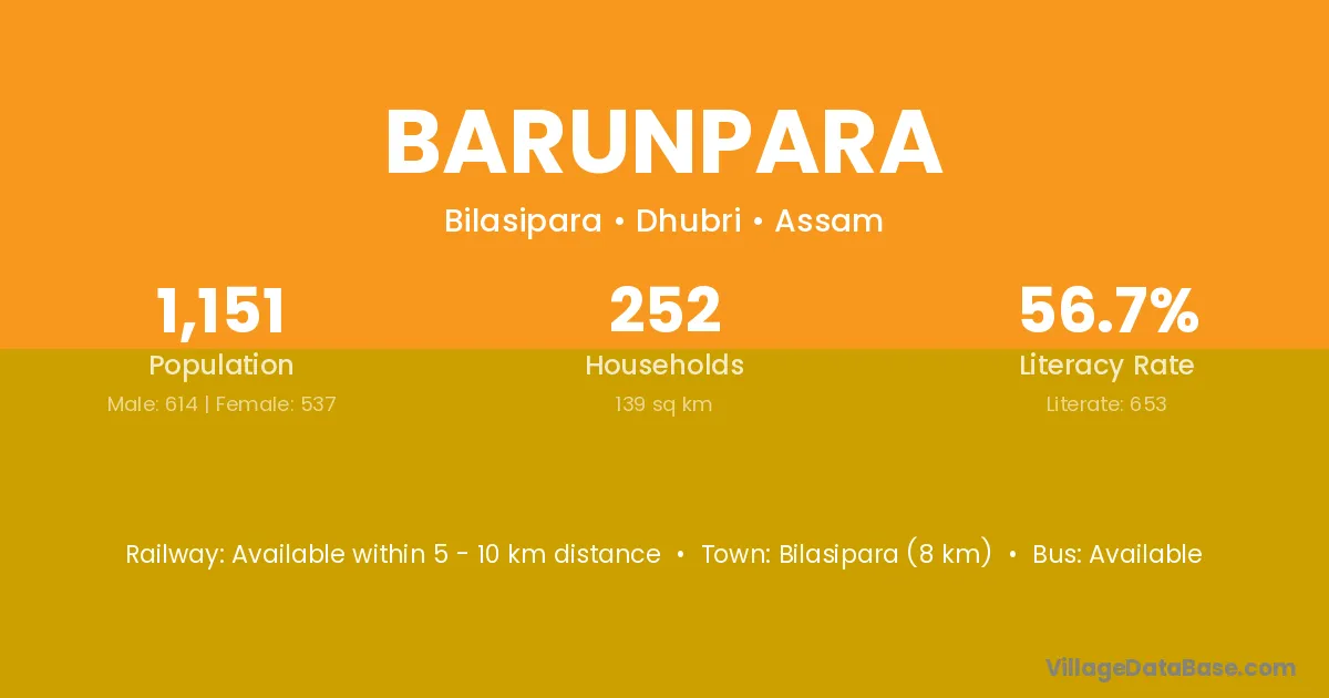 Bilasipara (8 km) is the nearest town to Barunpara village for major economic activities and is located approximately 8 km away.