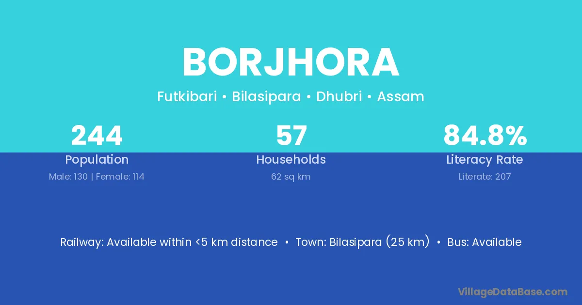 Bilasipara (25 km) is the nearest town to Borjhora village for major economic activities and is located approximately 25 km away.