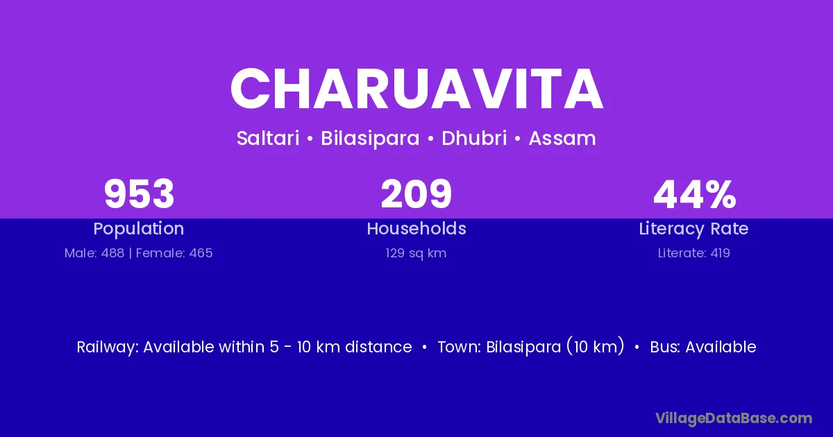 Bilasipara (10 km) is the nearest town to Charuavita village for major economic activities and is located approximately 10 km away.