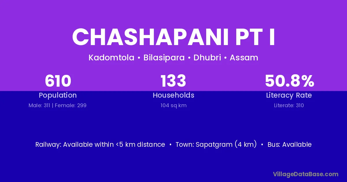 Sapatgram (4 km) is the nearest town to Chashapani Pt I village for major economic activities and is located approximately 4 km away.